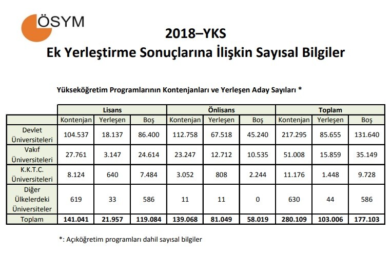 2019 Yükseköğretim Kurumları Sınavı (YKS) sonuçlarına göre 2019-2020 öğretim yılı için yükseköğretim programlarına ek yerleştirme işlemleri tamamlanmıştır. Adaylar, ek yerleştirme sonuçlarına, 19 Eylül 2019 tarihinde saat 14.45’ten itibaren ÖSYM’nin https://sonuc.osym.gov.tr internet adresinden T.C. Kimlik numaraları ve şifreleri ile erişebileceklerdir.